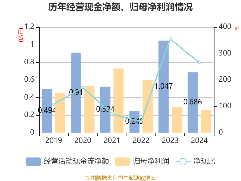 截至2024年,公司经营活动现金流净额为6860.69万元,同比下降34.49%;筹资活动现金流净额1.18亿元,同比增加6322.04万元;投资活动现金流净额-1.19亿元,上年同期为-1.9亿元。