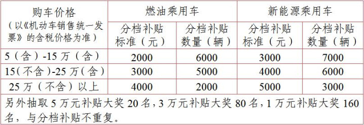 根据规定,购车价格在5万元(含)至15万元(含)区间,燃油乘用车补贴为2000元,新能源乘用车补贴为3000元;价格在15万元至25万元(含)区间,燃油车补贴3000元,新能源车补贴4000元;价格在25万元以上,燃油车补贴4000元,新能源车补贴5000元。各档补贴均设有相应名额。活动还设置了“补贴大奖”名额,包括5万元大奖20名、3万元大奖80名和1万元大奖160名。